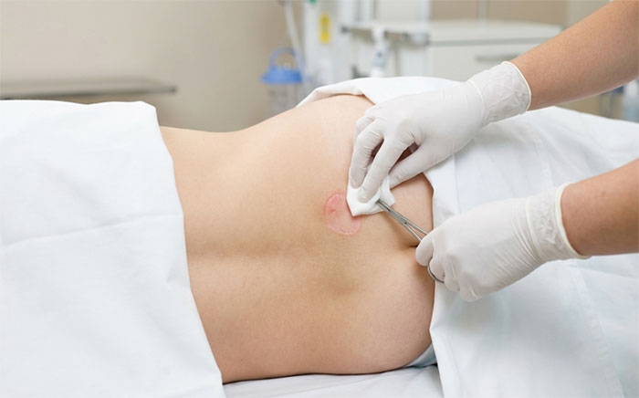 شست‌وشوی ملایم زخم با سرم نرمال سالین انجام شود. از الکل، بتادین غلیظ و آب‌اکسیژنه به‌طور مداوم استفاده نشود چون بافت سالم را تخریب می‌کنند.